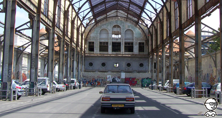 Hier fuhren mal Züge: Ein Peugeot 309 parkiert im ehemaligen Bahnhofsgebäude von Nizza.