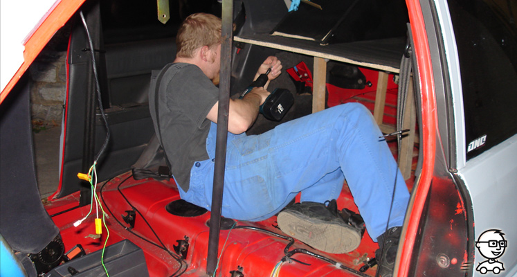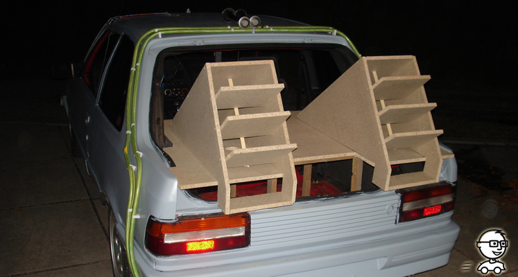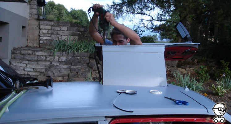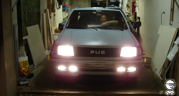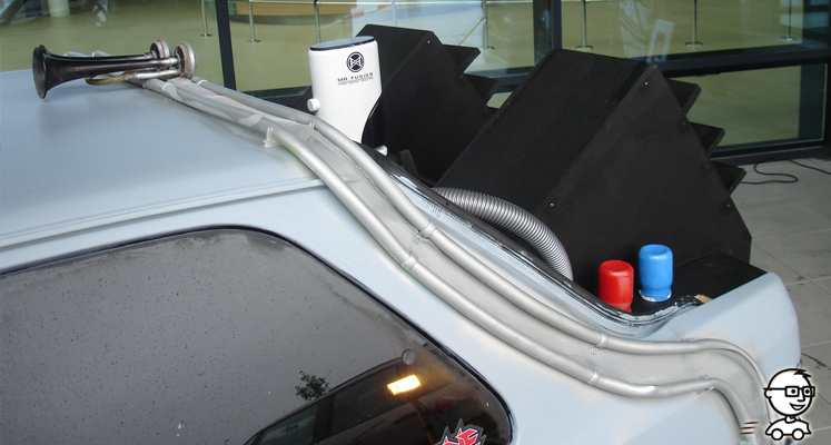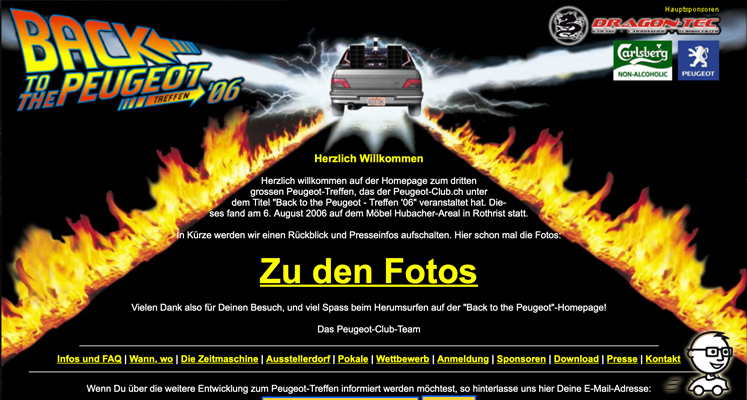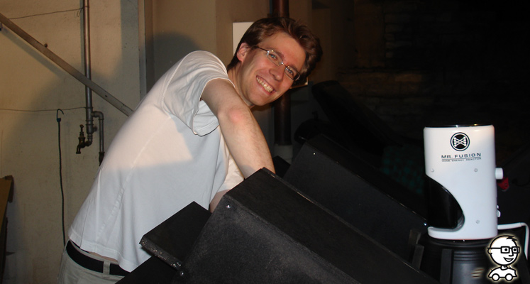 Auf dem Flyer und der Website prangt gross eine Peugeot-Zeitmaschine. Aber nicht nur da! Eine «richtige» Zeitmaschine soll den Besucherinnen und Besucher für Fotos bereitstehen. Nicht ein DeLorean wie im Film, sondern natürlich ein Peugeot – ein 309, der mit seinem schrägen Heckfenster er am ehesten aussieht wie die Zeitmaschine in meinem Lieblingsfilm. Und tatsächlich konnte ich genügend Club-Kolleginnen und -Kollegen von meiner Idee überzeugen. So basteln wir schon bald an einem Peugeot 309 herum. Das Schwierigste ist der Flügeltüren-Umbau. Vergleichsweise einfach ist der Aufbau auf der Rückseite: Auf den Unterbau kommen Luftauslässe aus Holz. Alte Staubsaugerschläuche und farbig angesprayte Joghurt-Becher müssen als technische Bestandteile hinhalten. Rundherum montieren wir ausrangierte Stromkabel, und ein aufgeschnittener Gartenschlauch mit Drahtgitter wird zum Flux-Band. Ganz originalgetreu ist immerhin der «Mr. Fusion» Energiereaktor: eine Krups Kaffeemühle, wie sie auch im Film eingesetzt wurde. Nur die Farbe, mit der wir das ganze Auto angestrichen haben, hat enttäuscht: Auf dem Deckel sah sie wesentlich überzeugender aus als auf dem Auto. Trotzdem hat das Resultat begeistert. Dieser Umbau gehört immer noch zum Verrücktesten, das ich je unternommen habe.